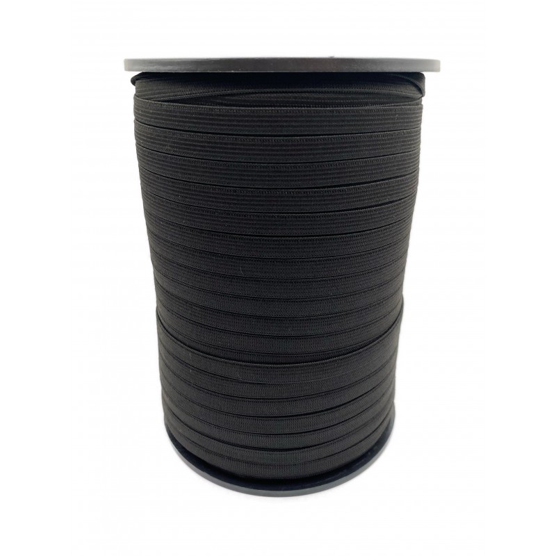 Rollo de goma elástica suave color negro de 6 milímetros de 575 metros. Es el blando que se usa habitualmente en ropa infantil.