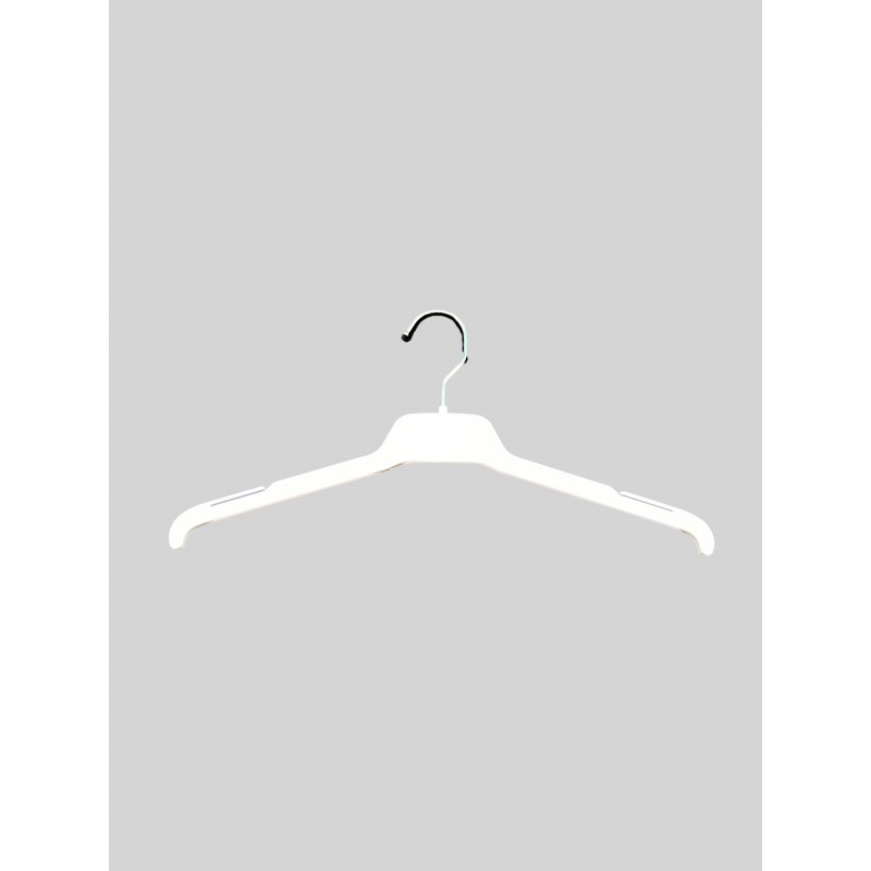 Percha de plástico de color blanco y gancho de plástico para conjuntos. Disponible en 24 y 30 centímetros de ancho, el largo son 38 cm. **DESCUENTO POR CANTIDAD EXCLUSIVO ONLINE**