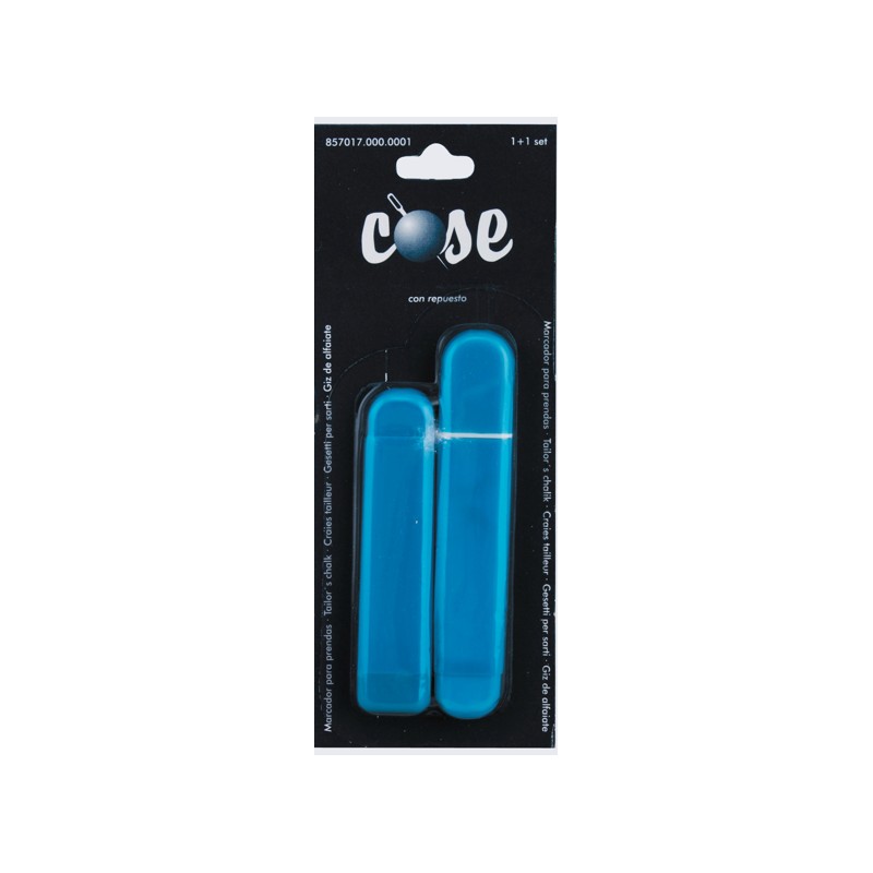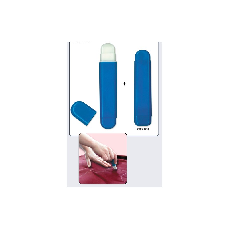 Lápiz marcador para prendas con una ruleta metálica para el marcado de tiza blanca. Cuenta con una anidad y un recambio.