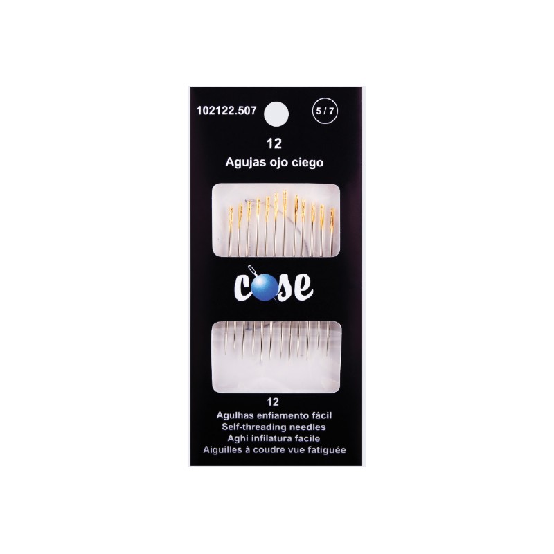 Cartera de 12 agujas con apertura superior para aquellas personas que les cuesten las cabezas normales de ojo dorado. Son de fácil enhrebrado. Surtidas entre los número 5 y 7. Ver dimensiones en la imagen.