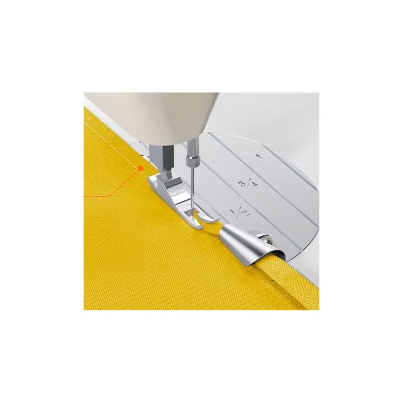 El prensatelas de 1/4 pulgadas (6 mm) permite coser costuras fijas, las hojas se cosen rápidamente para lograr un efecto de borde de costura preciso. Proporciona facilidad de uso para las tareas que podrían ser muy tediosas si sehicieran a mano.