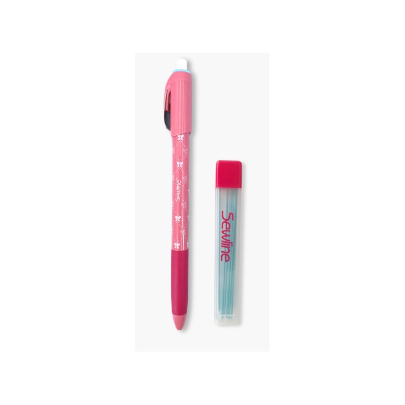 Marcador de tela con minas de cerámica especialmente formuladas para realizar líneas finas, limpias y claras en los tejidos. No deja marca como la tiza. Para borra use borrador o utilice un paño húmedo. Sin necesidad de afilar la punta, presione la parte superior y la mina fina de 0,9 mm se desplazará hacia abajo. El pack incluye un recambio de minas azul con 6 unidades.